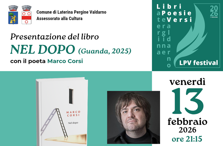 Venerdì 13 febbraio, alle ore 21:15, la Biblioteca Comunale “Massimo Zanoccoli” ospiterà il poeta Marco Corsi – finalista Premio Strega Poesia 2025 e vincitore Premio Letterario Giuseppe Dessì Poesia 2025 – per la presentazione della sua ultima raccolta, Nel dopo, edita da Guanda.