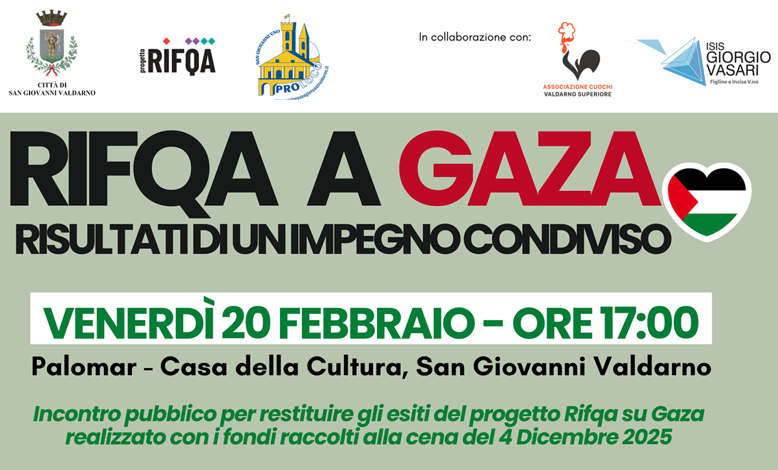 L’iniziativa rappresenta un momento di presentazione alla cittadinanza dei risultati ottenuto dal percorso avviato con la serata “Cena per Gaza – Olio, Za’atar e libertà”, organizzata dal Comune e dalla Pro Loco in collaborazione con l’associazione Cuochi Valdarno Superiore e con l’istituto alberghiero Giorgio Vasari di Figline e Incisa Valdarno.