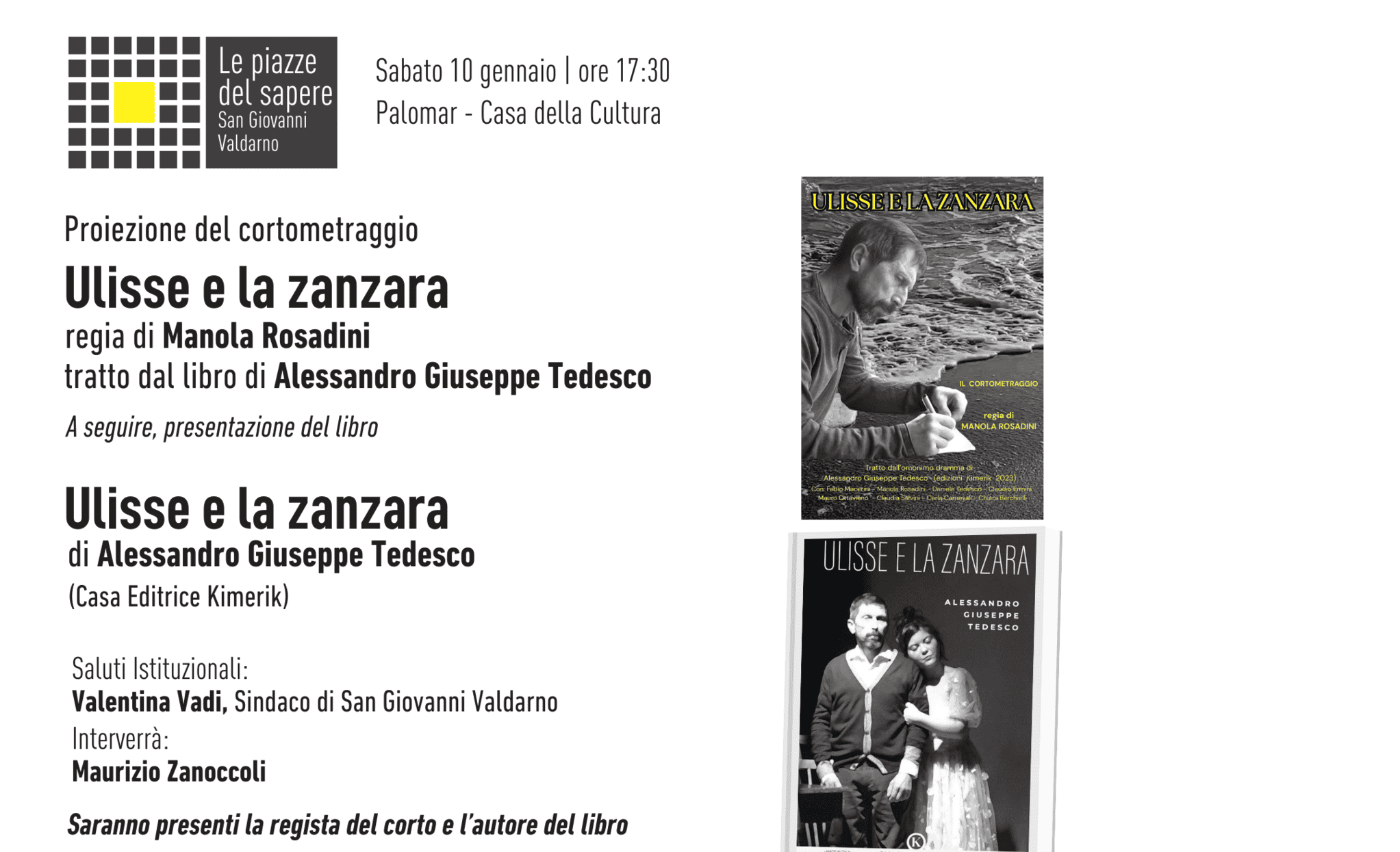 L’incontro si aprirà con la proiezione del cortometraggio Ulisse e la zanzara, per la regia di Manola Rosadini, tratto dall’omonimo libro di Alessandro Giuseppe Tedesco.