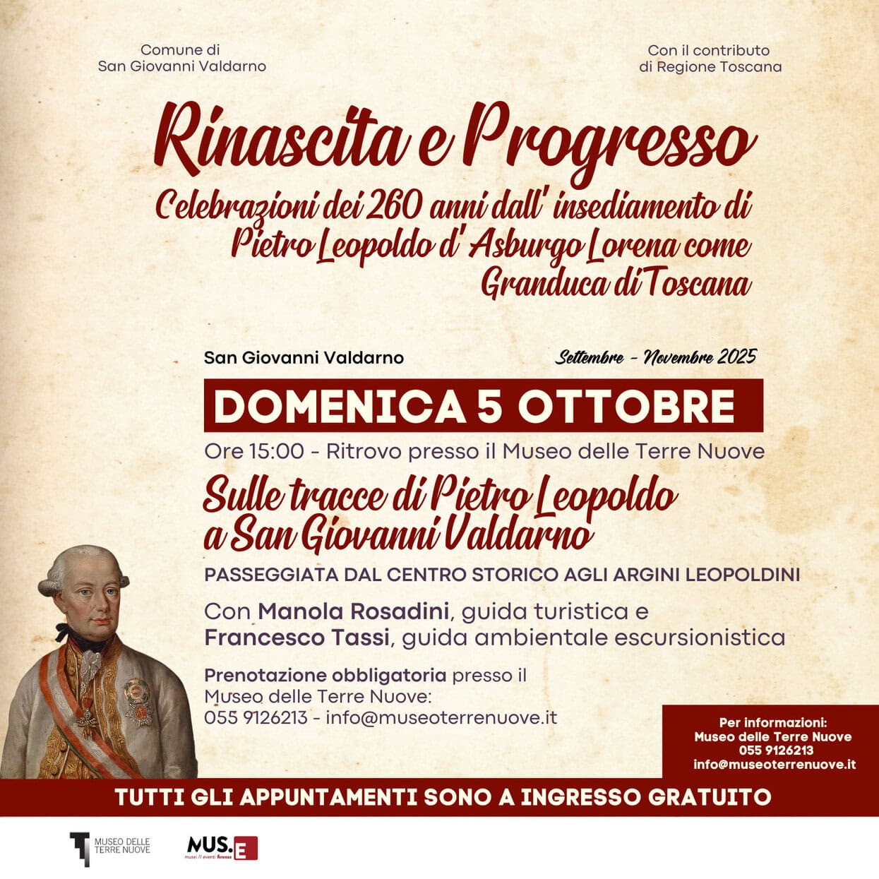 L’iniziativa rientra nelle celebrazioni per i 260 anni dall’insediamento di Pietro Leopoldo come Granduca di Toscana, promosse dal Comune di San Giovanni Valdarno insieme al Museo delle Terre Nuove e Fondazione MUS.E, con il contributo della Regione Toscana. La partecipazione è gratuita ma con prenotazione obbligatoria presso il Museo delle Terre Nuove (055 9126213 – info@museoterrenuove.it