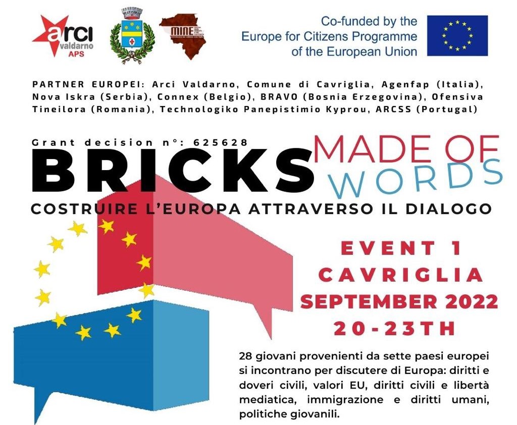 “Brick made of words” è un progetto dedicato ai giovani cittadini europei interessati a condividere conoscenze e prospettive su temi chiave per il loro futuro, come per il futuro dell’Unione Europea, con l’obiettivo di promuovere e incoraggiare l’impegno civico. Sono stati selezionati giovani dai 18 ai 24 anni di età, provenienti dalle comunità locali e internazionali, coinvolgendoli in un dialogo multidimensionale in connessione con la storia, i valori e il futuro dell’EU.
