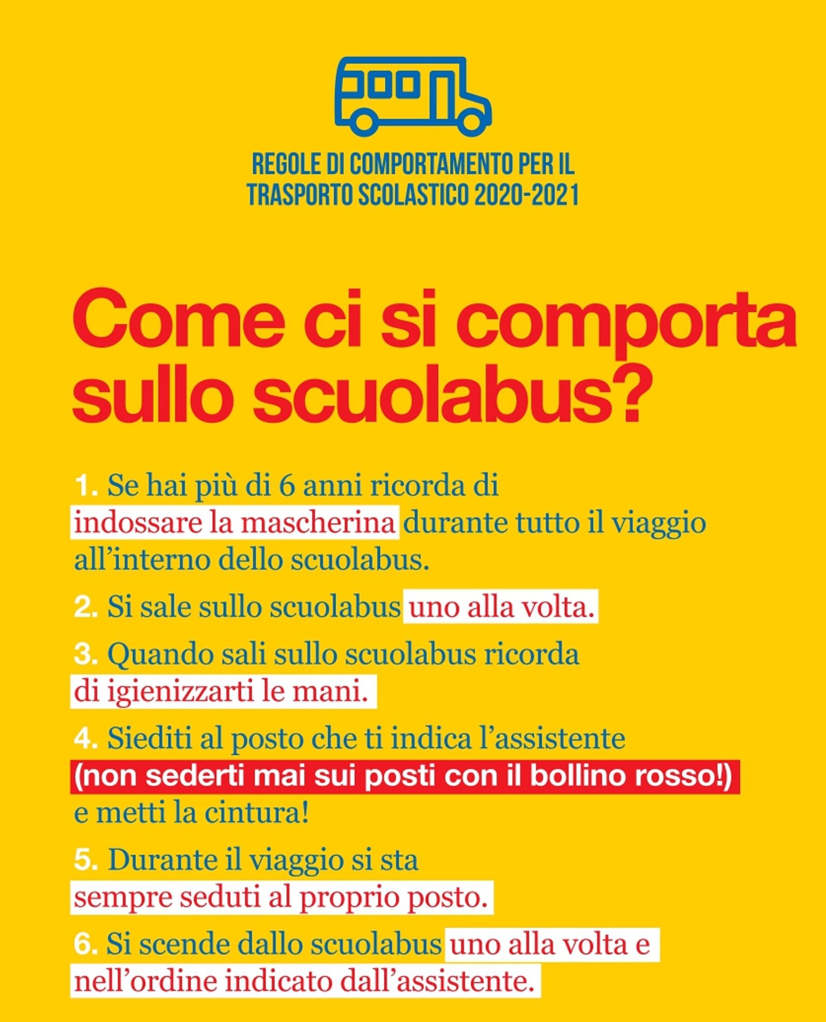 Ogni studente, dai sei anni in su, dovrà indossare la mascherina durante l’intero viaggio: all’ingresso sul pullman dovrà essere mantenuta la distanza interpersonale, salendo uno alla volta e con l’obbligo di igienizzazione delle mani, così come all’arrivo a destinazione, quando l’ordine di discesa sarà indicato dall’assistente incaricato dalla cooperativa Betadue, assegnataria del servizio da parte dell’Amministrazione Comunale.