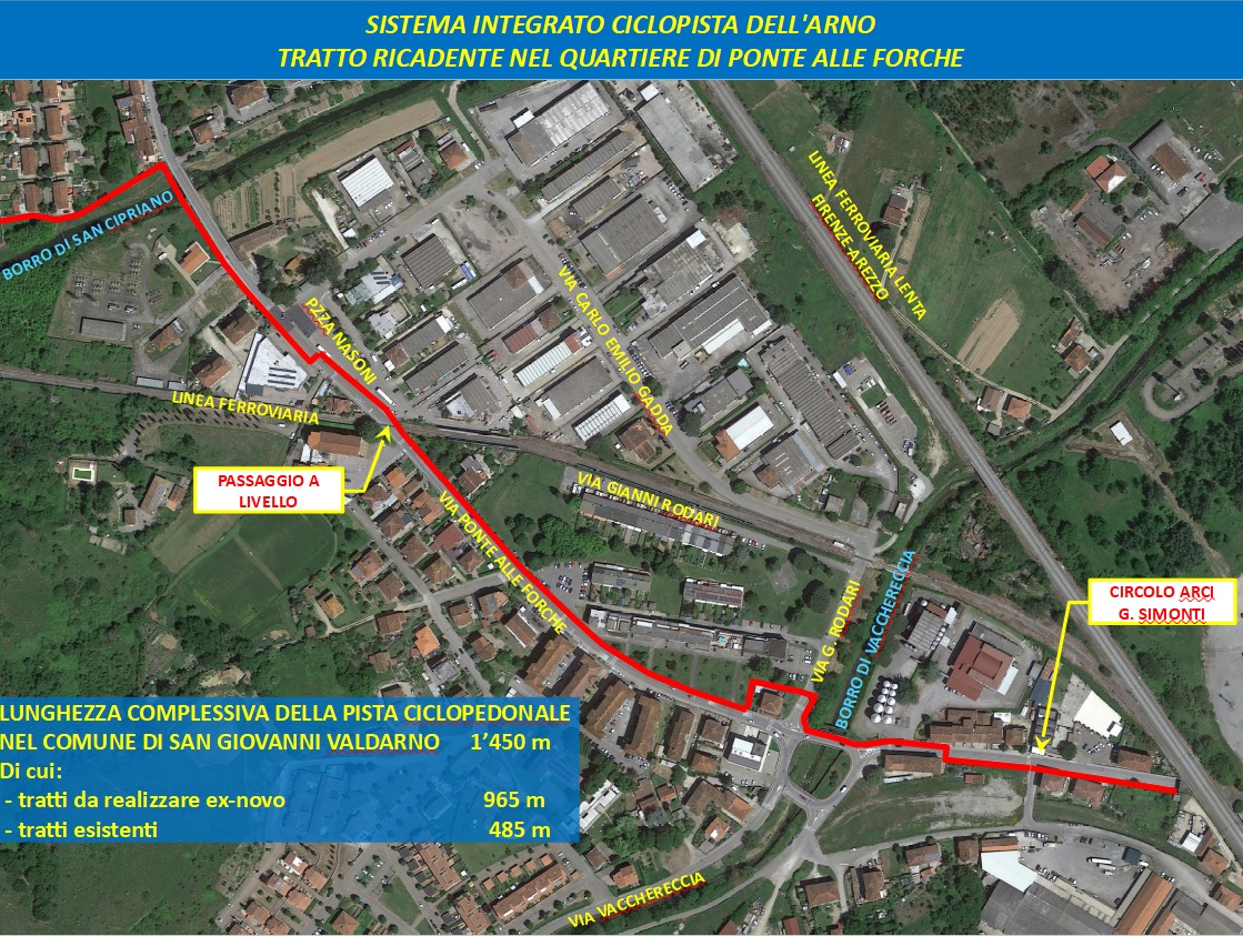 Inizieranno martedì 11 aprile i lavori di realizzazione della ciclopista del Chianti nel quartiere del Ponte alle Forche-Porcellino. L’opera di mobilità dolce fa parte del sistema integrato della ciclopista dell’Arno e si articola nei comuni di San Giovanni Valdarno e Cavriglia. Nel suo complesso, nel territorio sangiovannese, l’intervento si estende lungo via Ponte alle Forche, dal Circolo Arci “Sauro Billi” fino alla ciclabile interna al Villaggio Minatori e prevede la realizzazione di una pista ciclabile di collegamento con il centro cittadino, il rifacimento dei marciapiedi e l’asfaltatura del manto stradale, la messa in sicurezza degli attraversamenti pedonali che saranno illuminati.