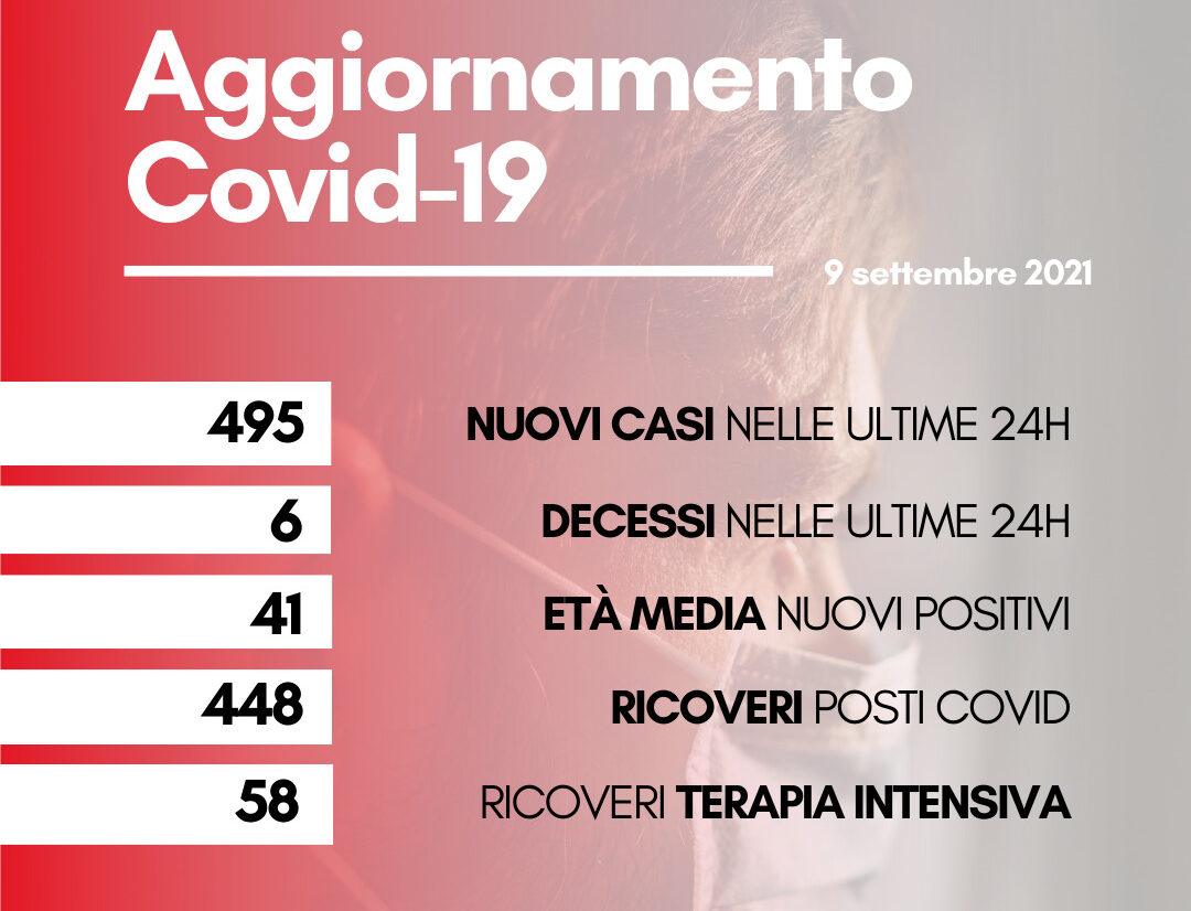 L’età media dei 495 nuovi positivi odierni è di 41 anni circa (19% ha meno di 20 anni, 30% tra 20 e 39 anni, 31% tra 40 e 59 anni, 13% tra 60 e 79 anni, 7% ha 80 anni o più).
