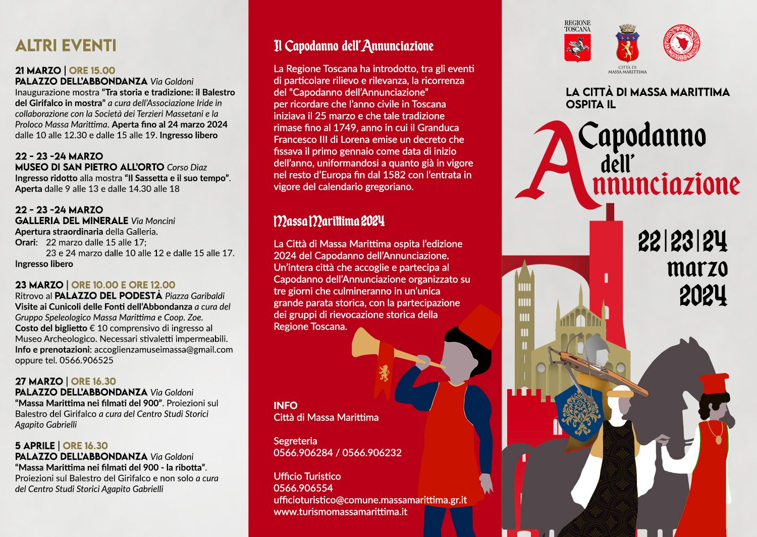 Gran finale domenica 24 marzo con le visite mattutine della città, della Società dei Terzieri Massetani e delle sedi dei Terzieri di Cittanova, Cittavecchia e Borgo e nel pomeriggio l’esibizione di alcuni gruppi di rievocazione nel centro storico.