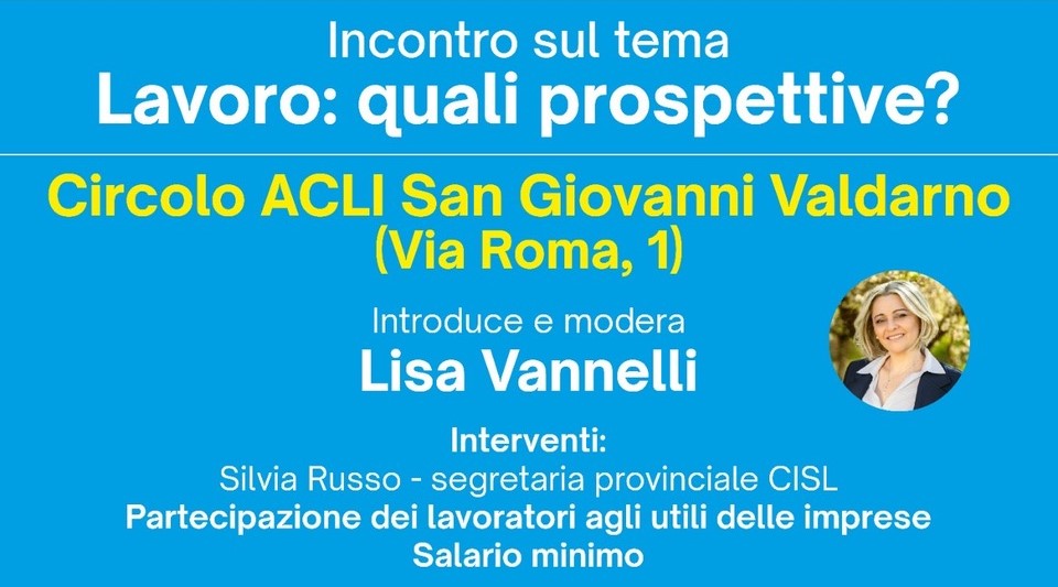 Venerdì 19 aprile alle ore 18 presso il Circolo ACLI di San Giovanni Valdarno, in via Roma 1, è in programma un incontro sul tema “Lavoro: quali prospettive?”.