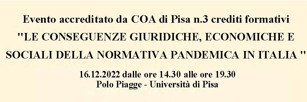 Venerdì 16 dicembre 2022 con inizio alle ore 14.30 presso il Polo Piagge dell’Università di Pisa Constitutio Italia promuove un evento accreditato da COA di Pisa con n. 3 crediti formativi dal titolo “Le conseguenze giuridiche, economiche e sociali della normativa pandemica in Italia“.