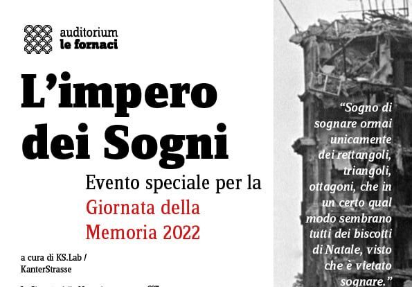 TERRANUOVA BRACCIOLINI. Sabato 12 febbraio, alle ore 21:15, andrà in scena sul palco dell’Auditorium Le Fornaci lo spettacolo “L’impero dei sogni” realizzato dagli allievi del laboratorio di teatro a cura di KanterStrasse, in occasione della Giornata della Memoria 2022.