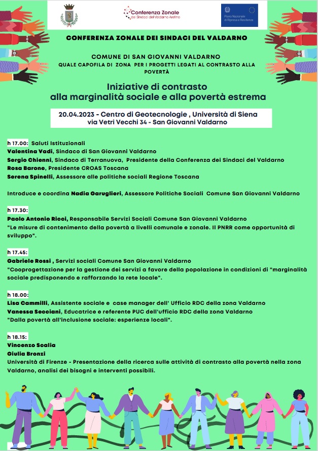 Un convegno per parlare delle iniziative di contrasto alla marginalità e alla povertà estrema. Si svolgerà giovedì 20 aprile a partire dalle 17 al Centro di GeoTecnologie di San Giovanni Valdarno, il convegno dove saranno presentati i progetti di zona che coinvolgono tutti gli otto comuni del Valdarno, organizzato dal Comune di San Giovanni che rappresenta l’Ente capofila.