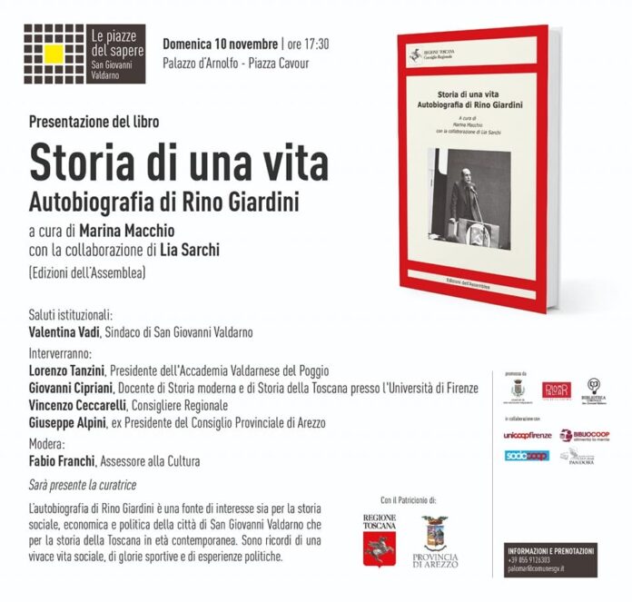 Domenica 10 novembre alle 17,30 nella sala conferenze del Museo delle Terre Nuove sarà presentato il libro “Storia di una vita, autobiografia di Rino Giardini”, a cura di Marina Macchio con la collaborazione di Lia Sarchi, edizioni dell’Assemblea, Consiglio Regionale della Toscana.