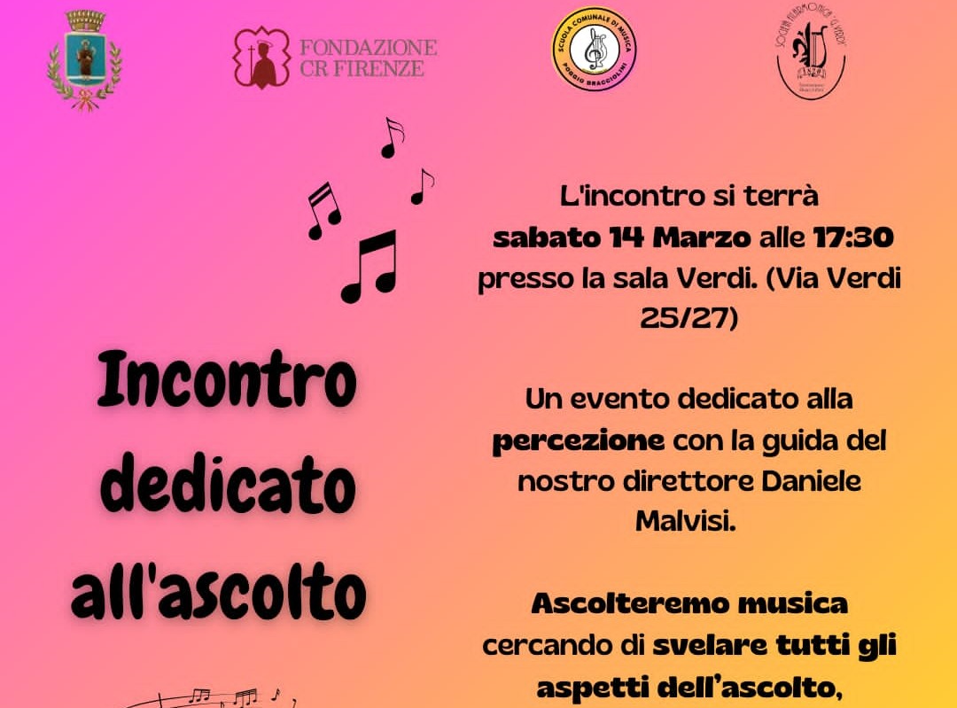Sabato 14 marzo, alle ore 17:30, nella Sala Verdi (Via Verdi 25/27), si terrà l’incontro organizzato dalla scuola comunale di musica, Poggio Bracciolini, “Incontro dedicato all’ascolto”, un evento aperto al pubblico che guiderà i partecipanti alla scoperta dei molteplici aspetti della percezione musicale.